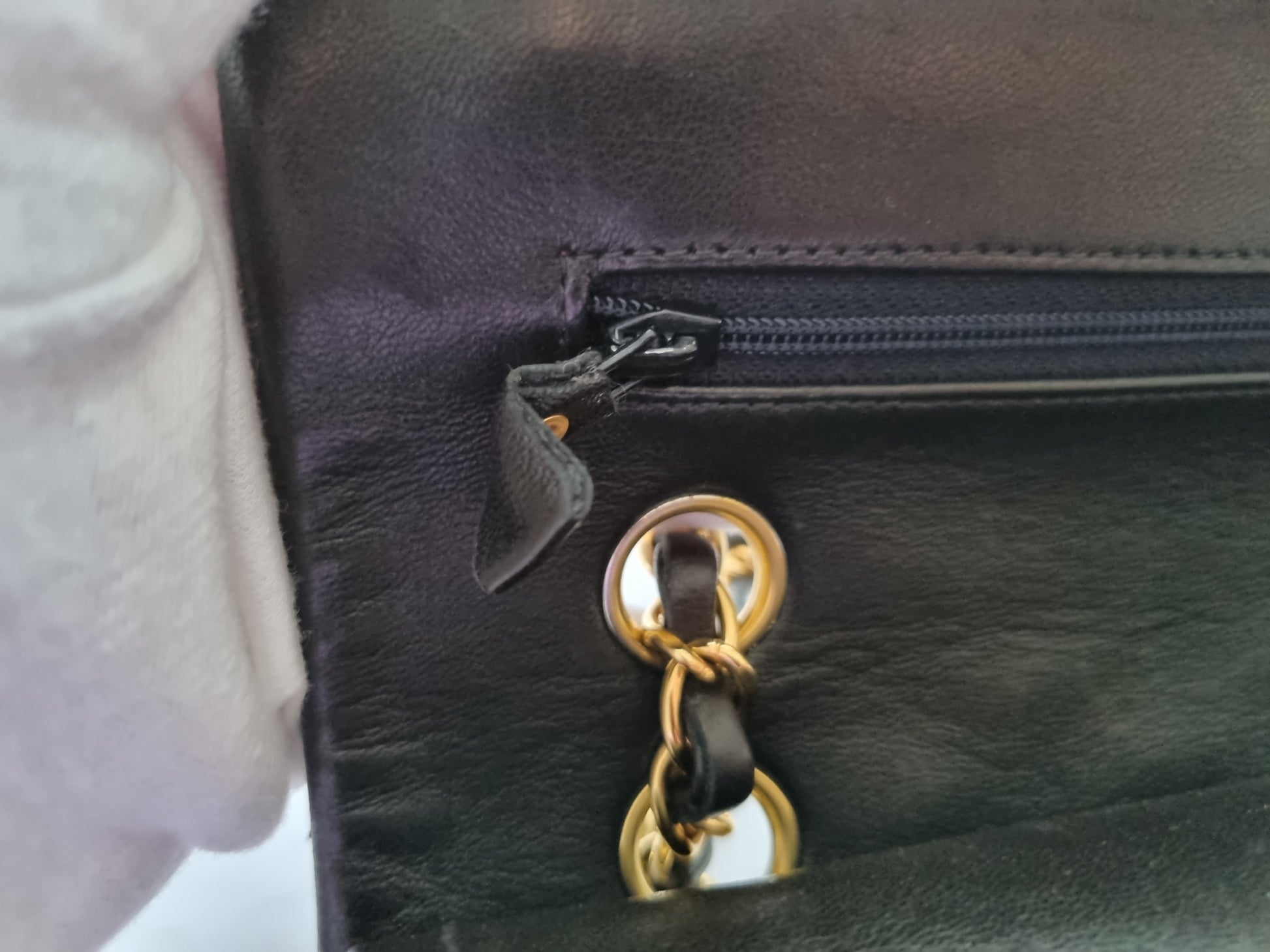 - die Lederlasche am Reißverschluss innen hat Knicke