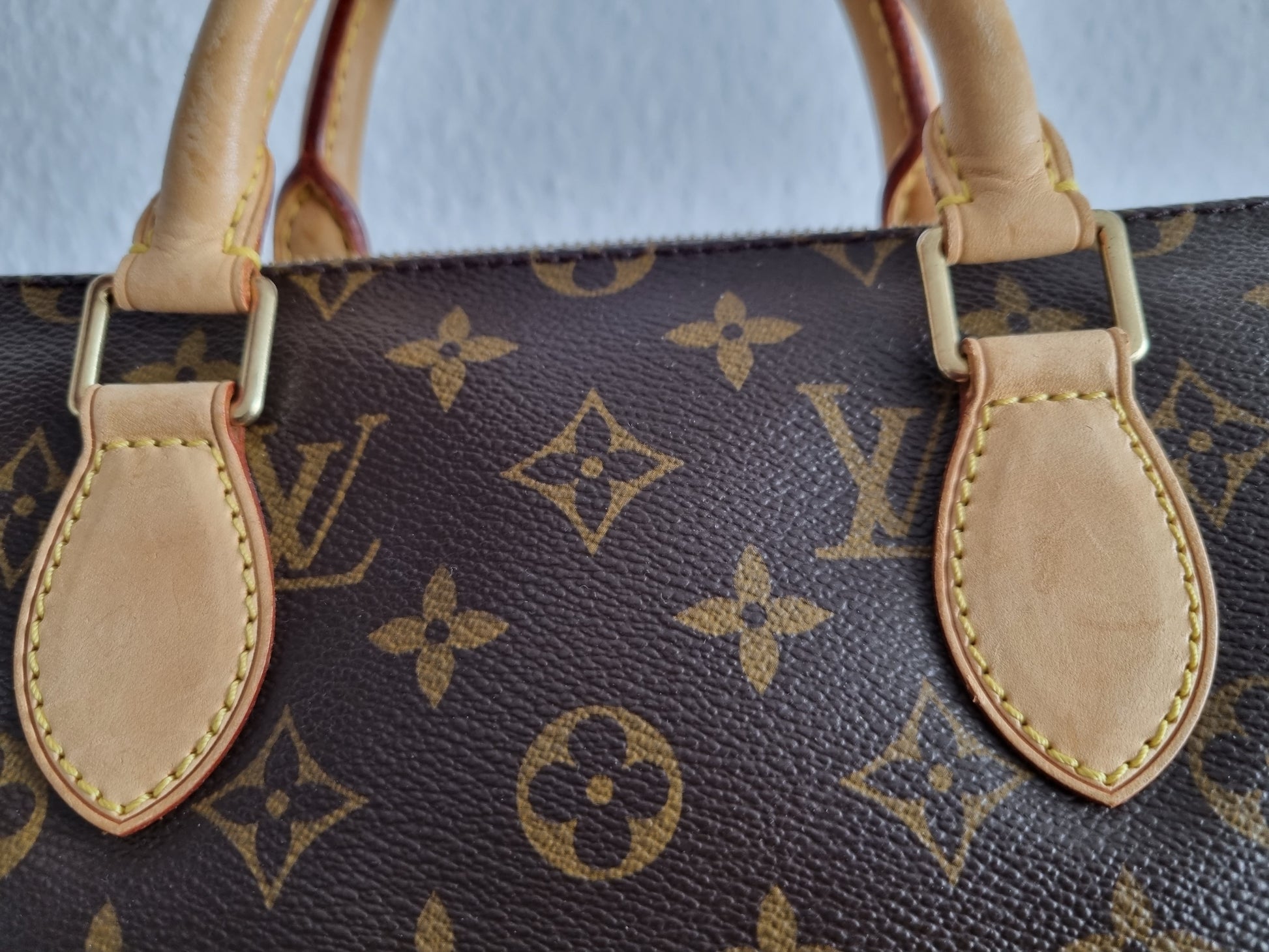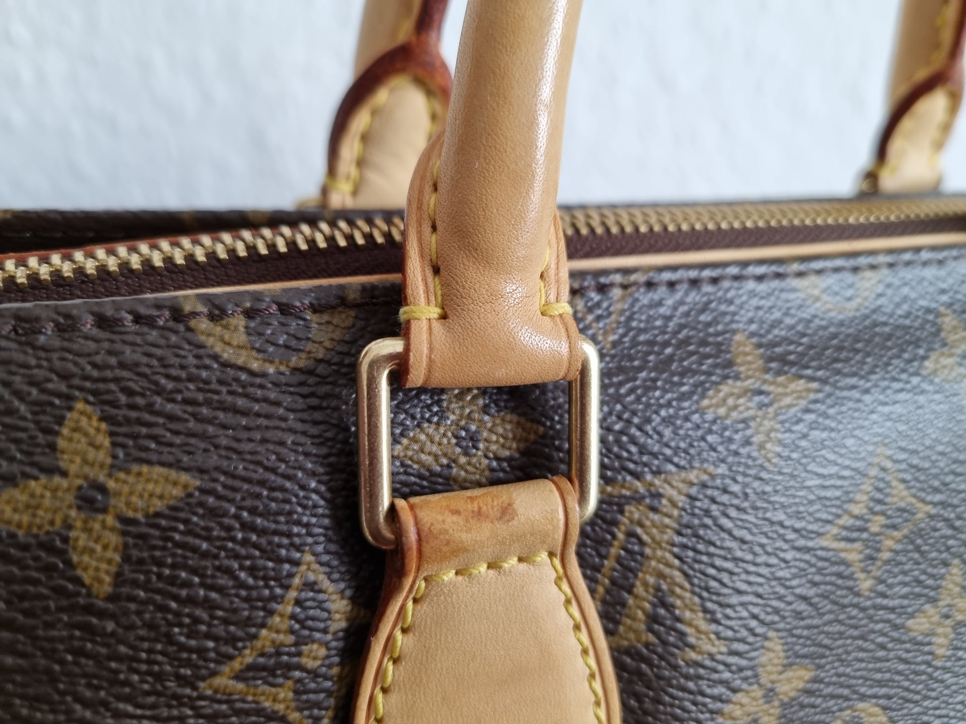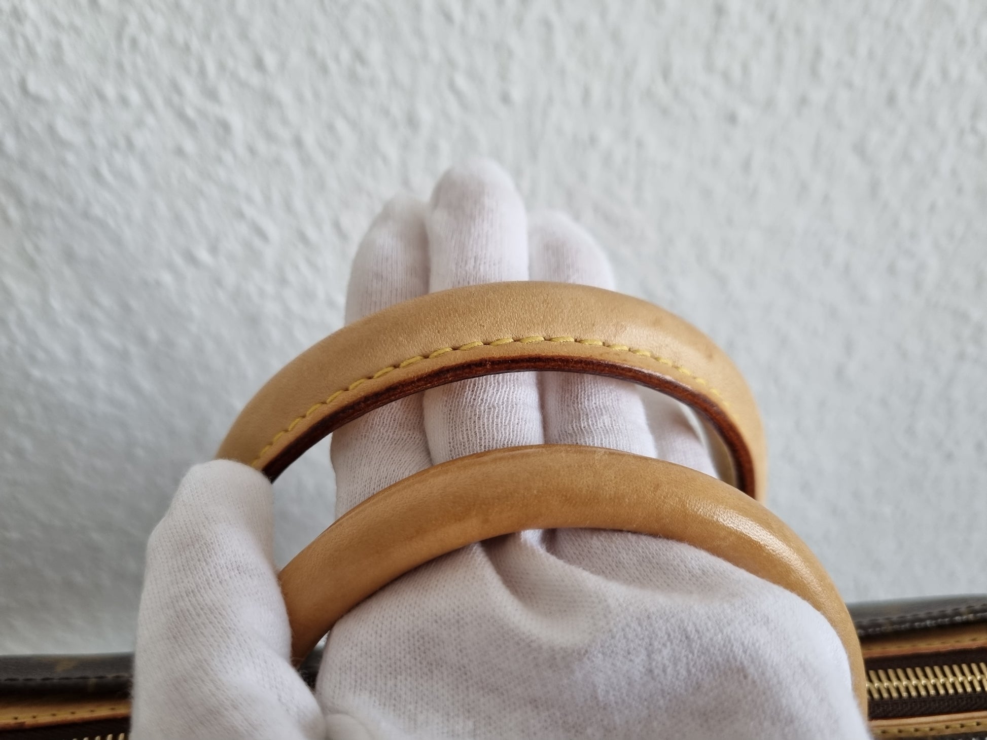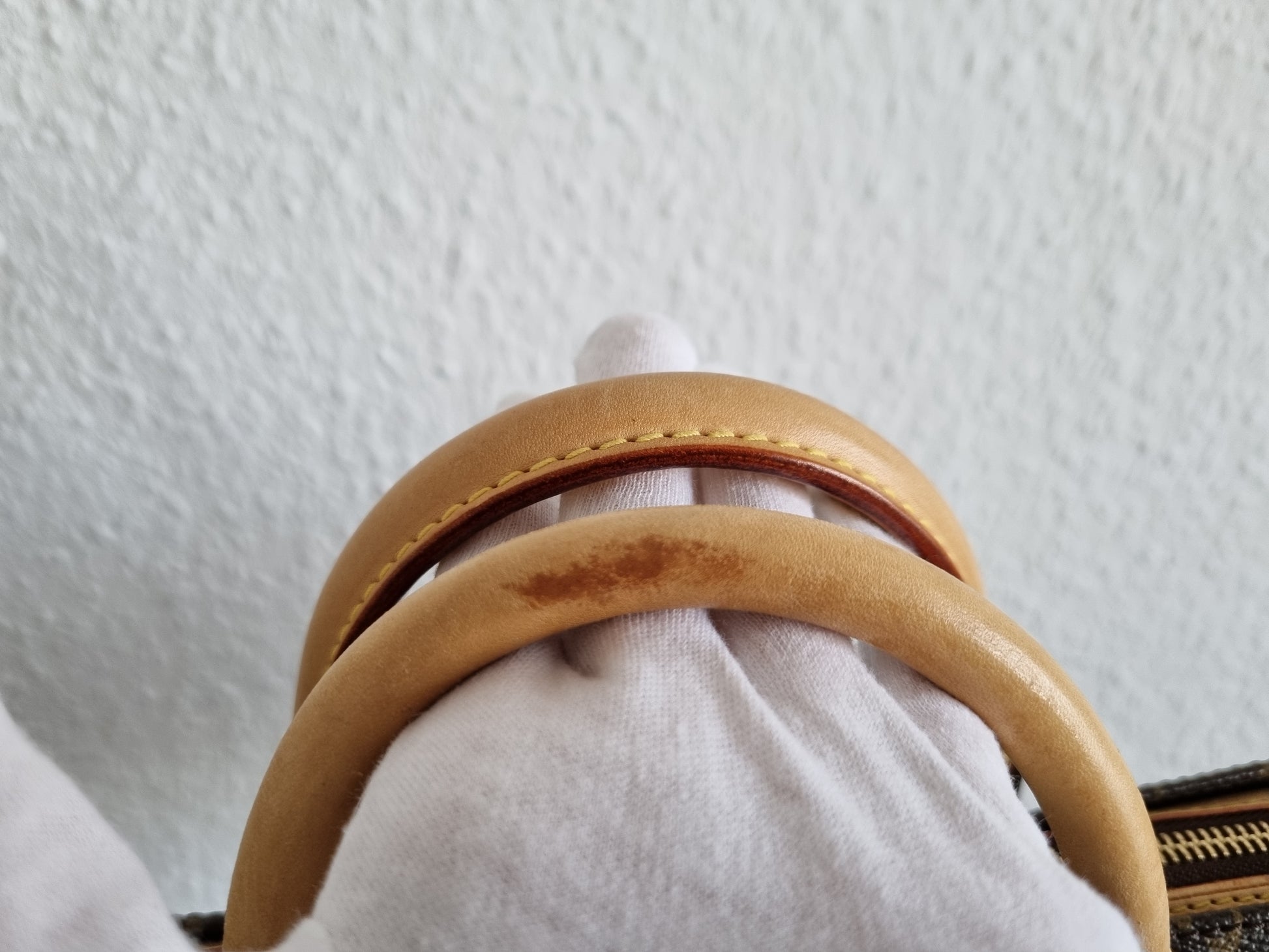 - Leder seitlich am Taschenboden spröde und mittig leicht "rissig", Ränder leicht fleckig